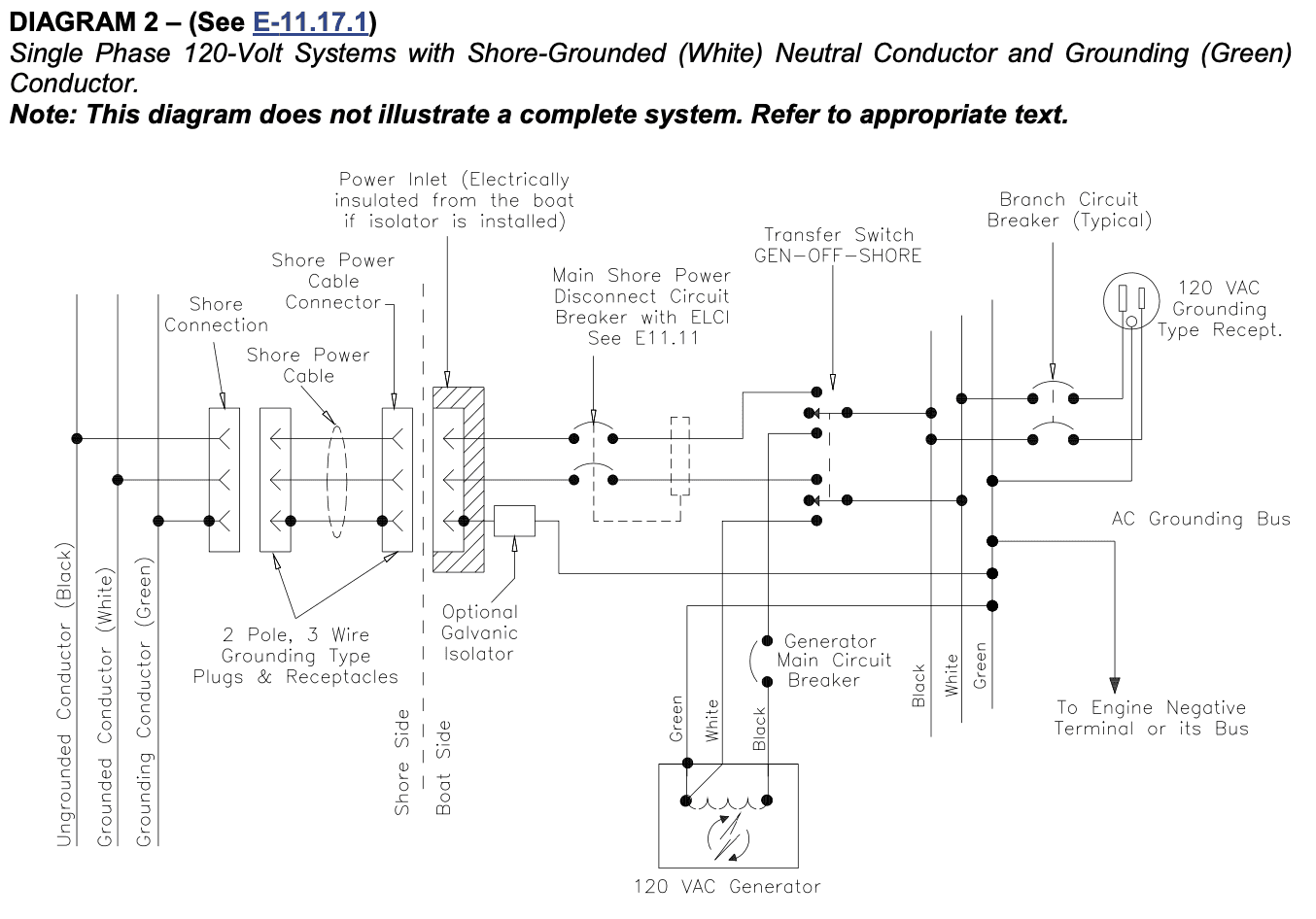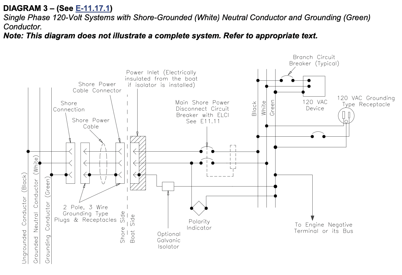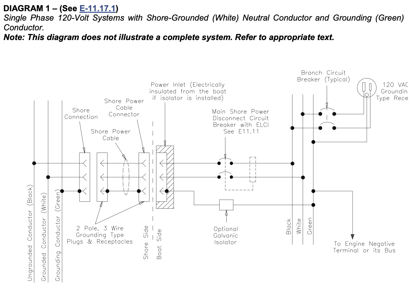 11.17.1 Single Phase 120-Volt Systems with Shore-Grounded (White) Neutral Conductor and Grounding (Green) Conductor. (See DIAGRAM 1, DIAGRAM 2 and DIAGRAM 3.)