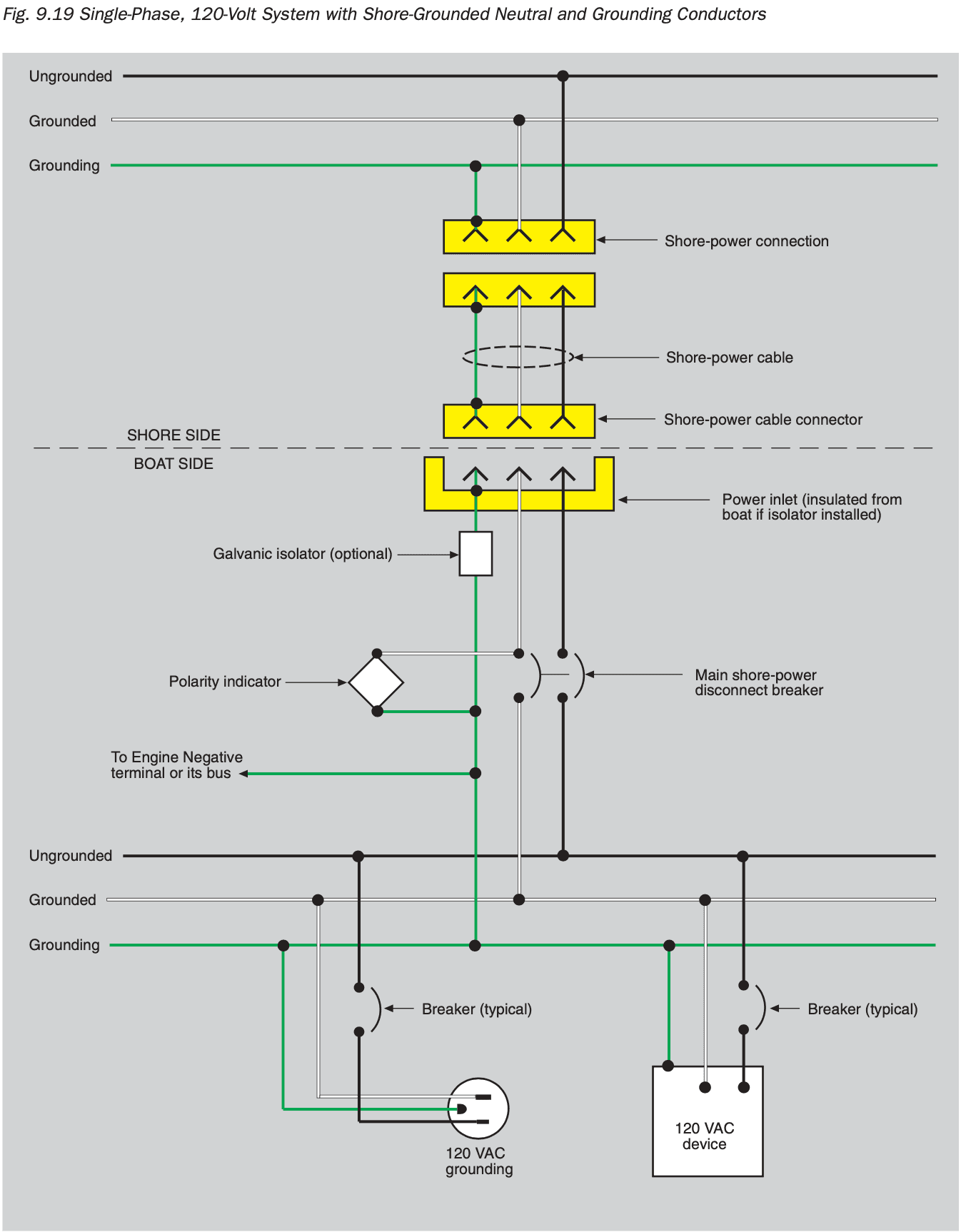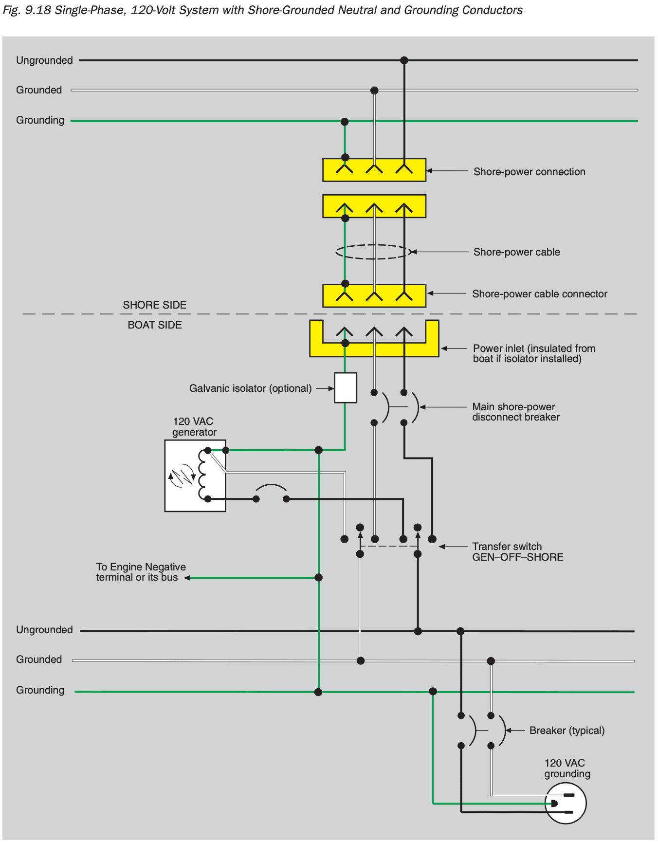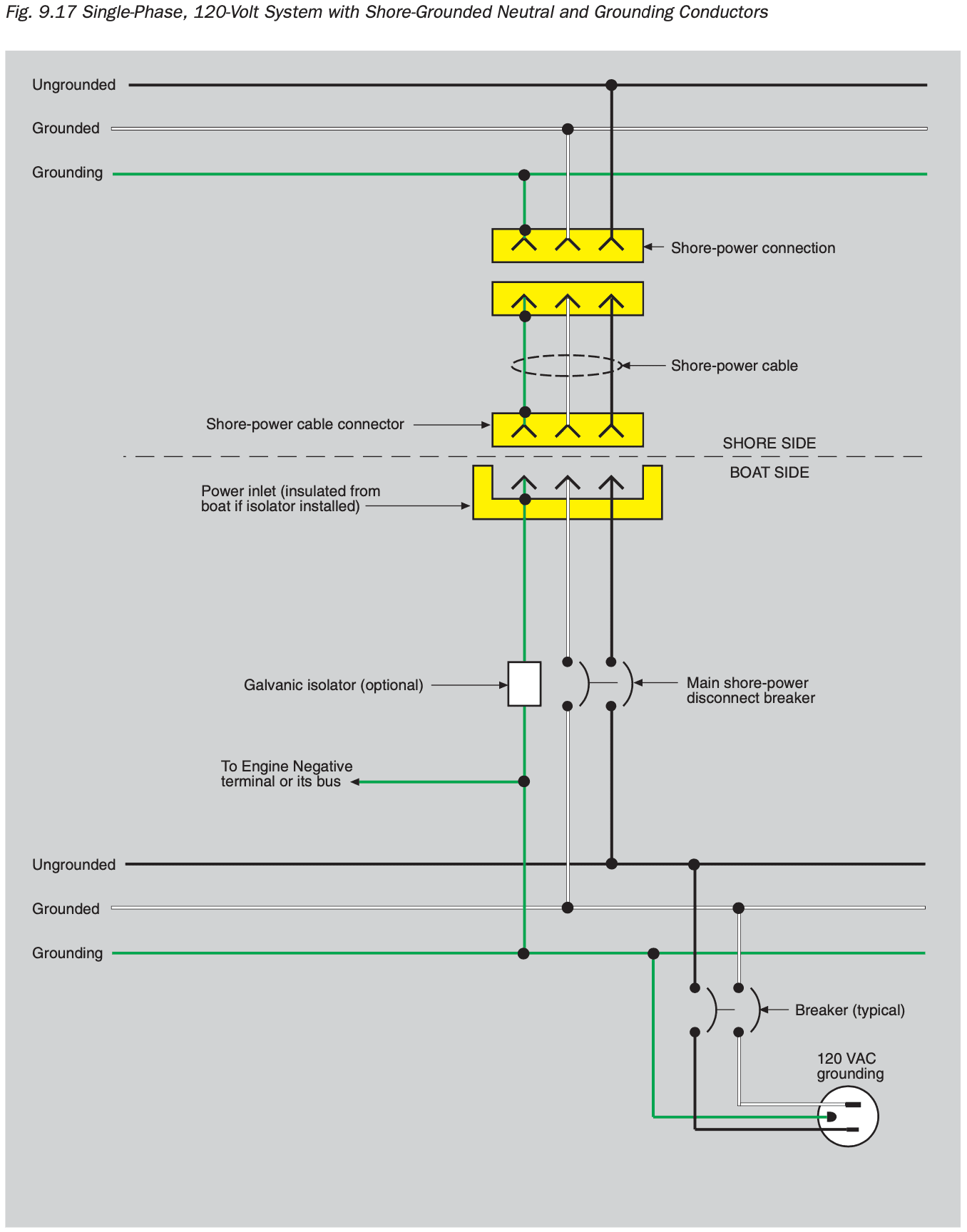 11.17.1 Single Phase 120-Volt Systems with Shore-Grounded (White) Neutral Conductor and Grounding (Green) Conductor. (See DIAGRAM 1, DIAGRAM 2 and DIAGRAM 3.)